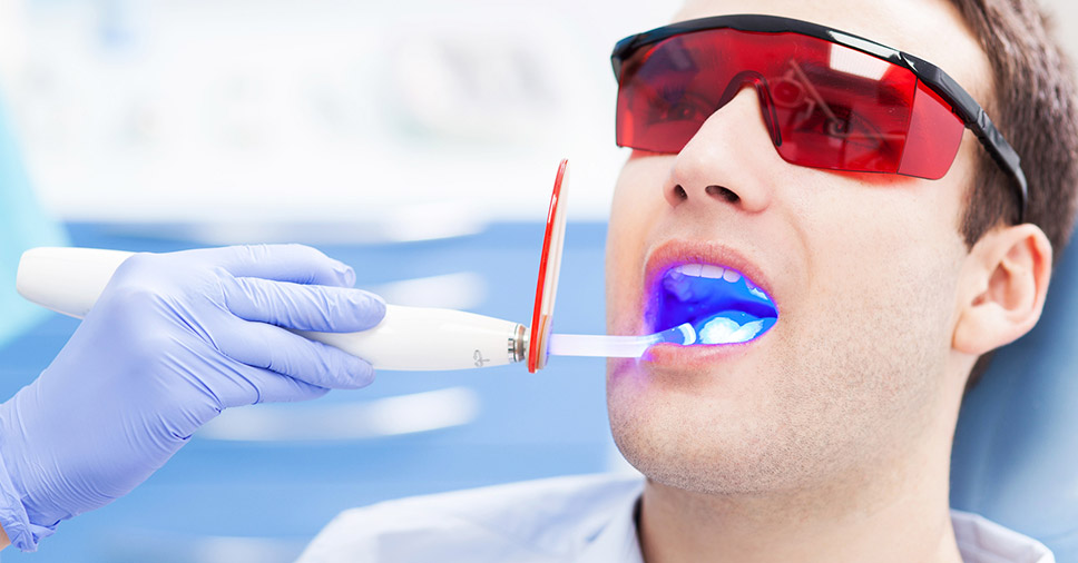 Clareamento dental: ativação do gel clareador e polimerização de barreiras gengivais.